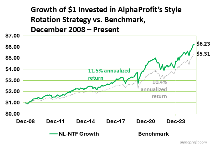 AlphaProfit’s disciplined style rotation methodology has delivered strong results since 2009. Since inception, the strategy has gained at an 11.5% annualized rate, compared to 10.4% for its benchmark.