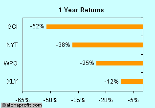 Against this miserable advertising scenario, it is hardly a surprise that newspaper stocks have suffered massive declines. GCI and NYT shares have seen nearly 52% and 38% of their value wiped out over the past year while WPO shares are down 25%. These stocks have underperformed shares in the consumer discretionary sector where the Consumer Discretionary Select Sector SPDR (XLY) is down 12%.